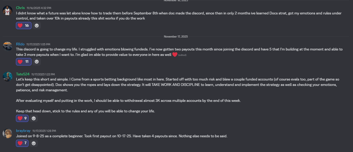 Let’s keep this short and simple. I Come from a sports betting background like most in here. Started off with too much risk and blew a couple funded accounts (of course evals too, part of the game so don’t get disappointed). Doc shows you the ropes and lays down the strategy. It will TAKE WORK AND DISCIPLINE to learn, understand and implement the strategy as well as checking your emotions, patience, and risk management. After evaluating myself and putting in the work, I should be able to withdrawal almost 3K across multiple accounts by the end of this week. Keep that head down, stick to the rules and any of you will be able to change your life.